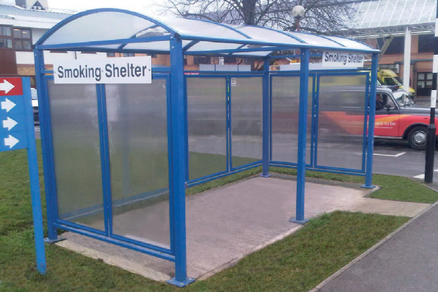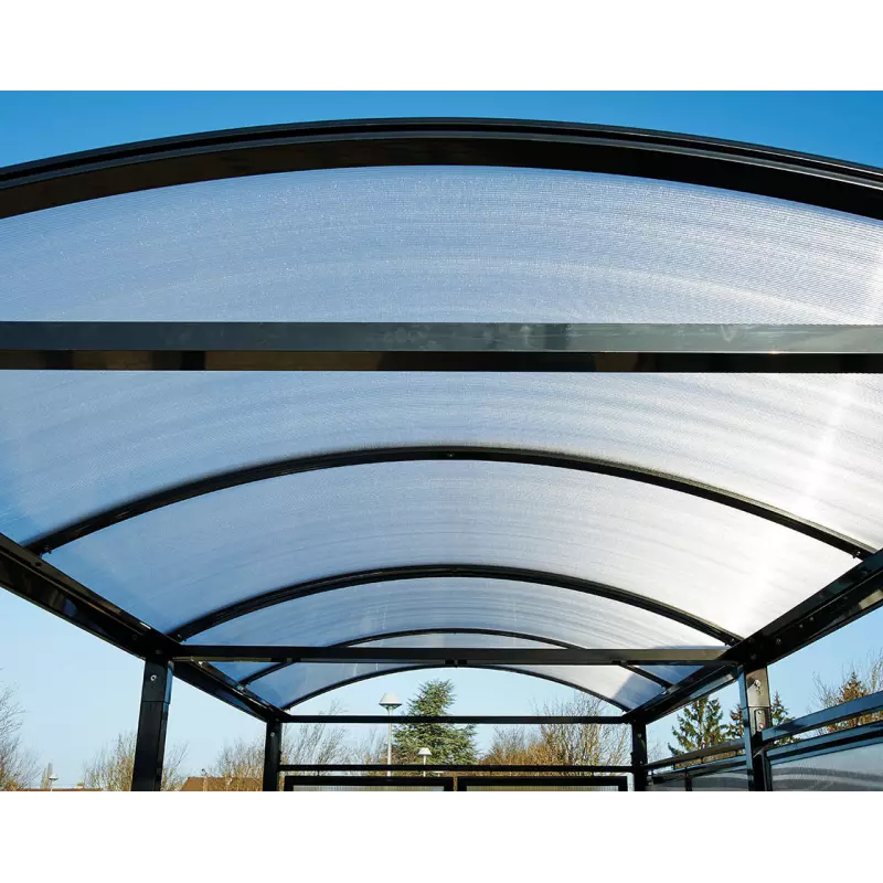 Complies with UK smoking shelter regulations. The shelter makes large use of cellular anti-UV-treated 10 mm cellular polycarbonate rather than PET for logevity and safety.