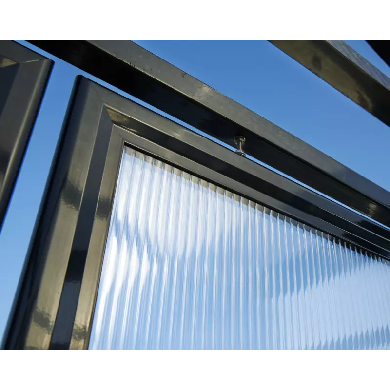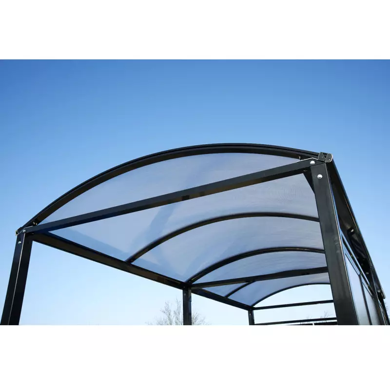 Roof: 50 x 30 mm aluminium crossbeams and rain gutters, anti-UV-treated 6 mm cellular polycarbonate roof.